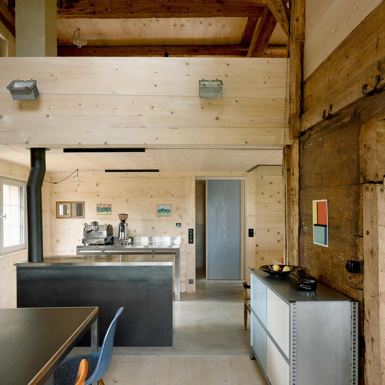 Während der Sanierung legten die Architekten grossen Wert darauf, den ursprünglichen Charakter des Hauses zu bewahren. Eine dendrochronologische Untersuchung ergab, dass einige der Balken über 600 Jahre alt sind. Im Inneren wurden moderne Elemente behutsam integriert: So setzt die Chromstahlküche einen zeitgenössischen Akzent, während der traditionelle Holzherd erhalten blieb und weiterhin zum Heizen genutzt wird.