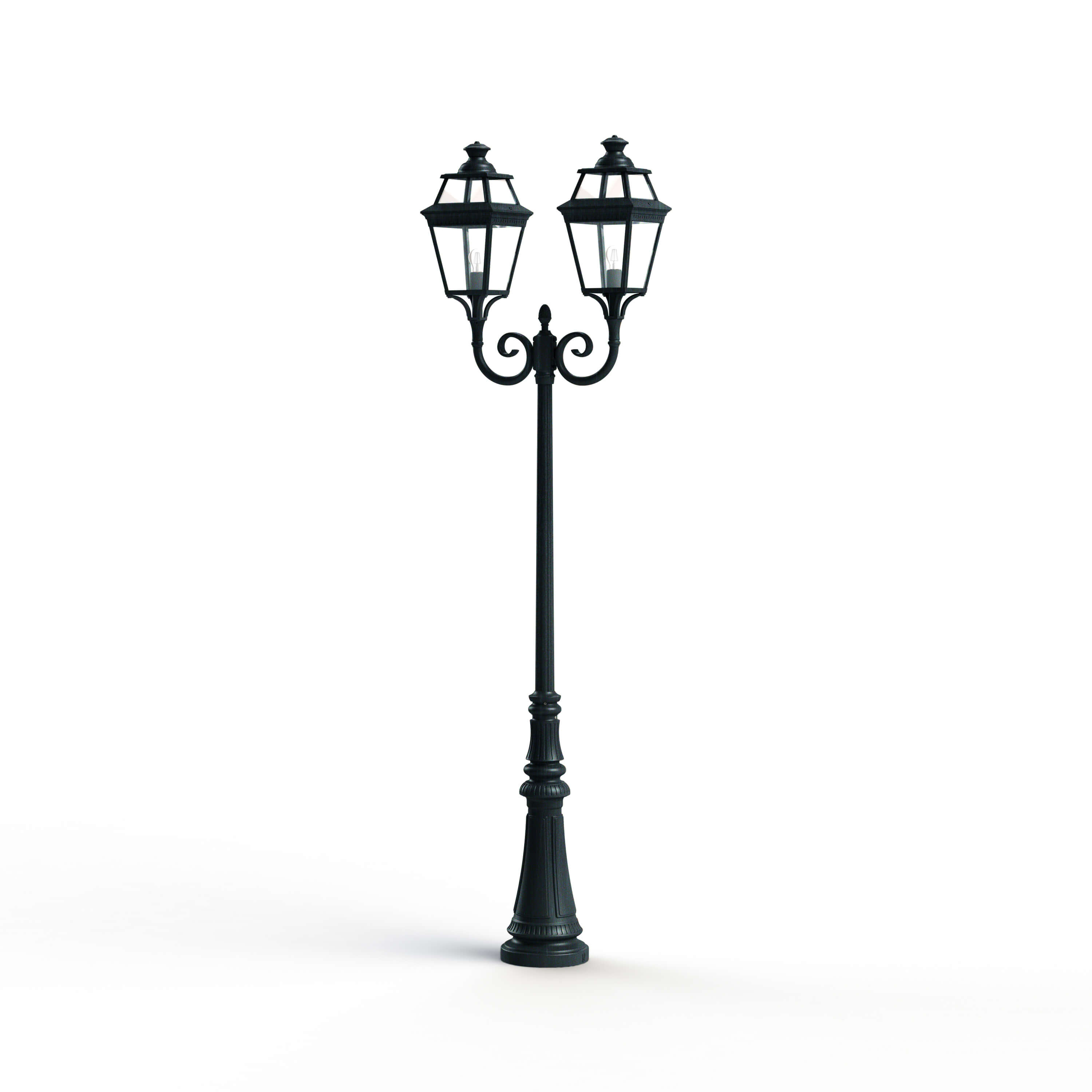 Aussenleuchte Place des Vosges 3 M7 von Roger Pradier© mit einer Höhe von 277.5cm und einer Breite von 82.6cm. Produziert in Frankreich bei höchster Qualität, welche mit einer Antikorrisionsgarantie von 25 Jahren zugesichert wird. Die Leuchte ist mit einem IP44 Schutz versehen und so gegen die meisten Einwirkungen aus dem Alltag abgesichert. Wähle die passende Konfiguration (Glas, Farbe, Leuchtmittel etc.) um deinen Vorstellungen gerecht zu werden.