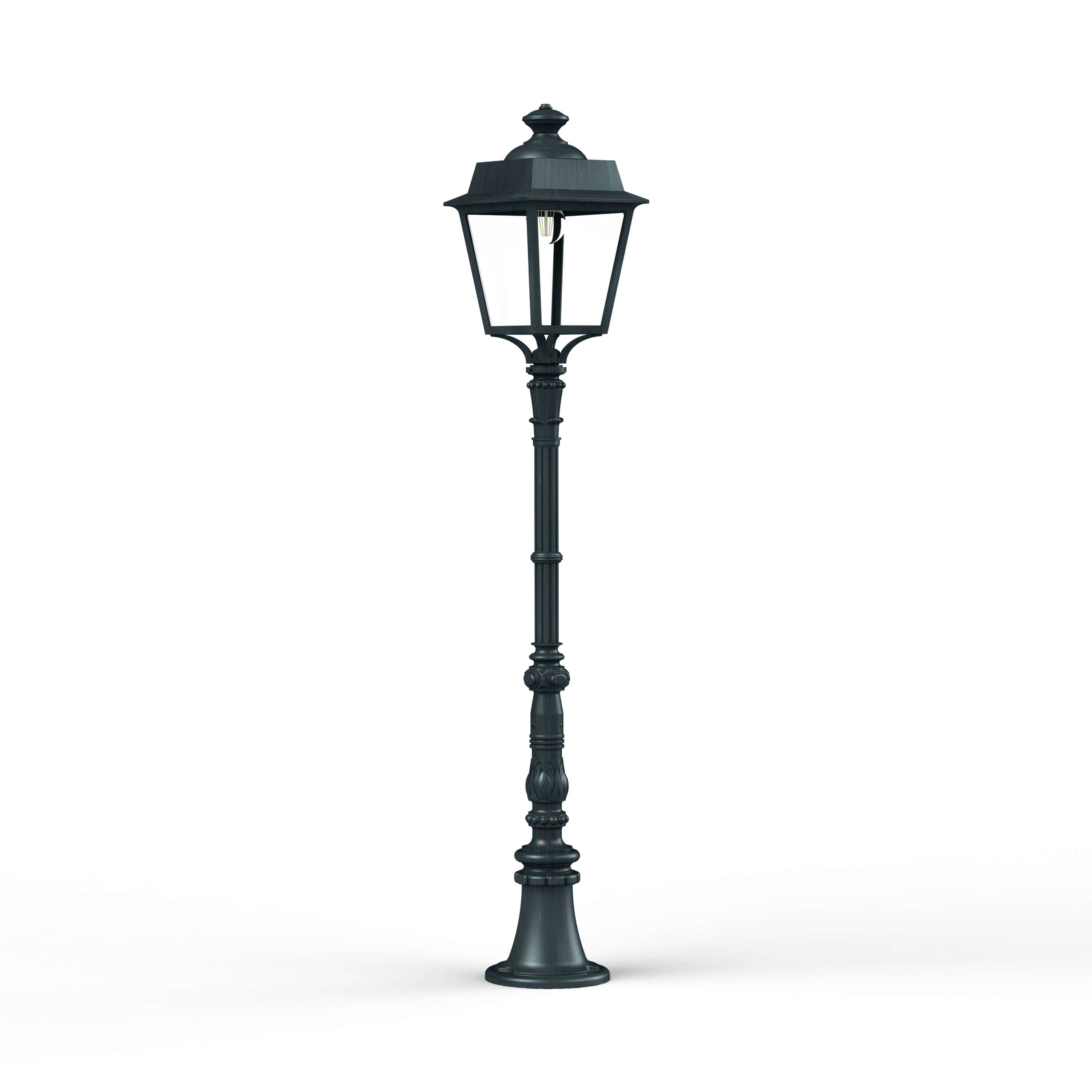 Aussenleuchte Place des Vosges 1 Evolution M11 von Roger Pradier© mit einer Höhe von 130.7cm und einer Breite von 22cm. Produziert in Frankreich bei höchster Qualität, welche mit einer Antikorrisionsgarantie von 25 Jahren zugesichert wird. Die Leuchte ist mit einem IP65 Schutz versehen und so gegen die meisten Einwirkungen aus dem Alltag abgesichert. Wähle die passende Konfiguration (Glas, Farbe, Leuchtmittel etc.) um deinen Vorstellungen gerecht zu werden.
