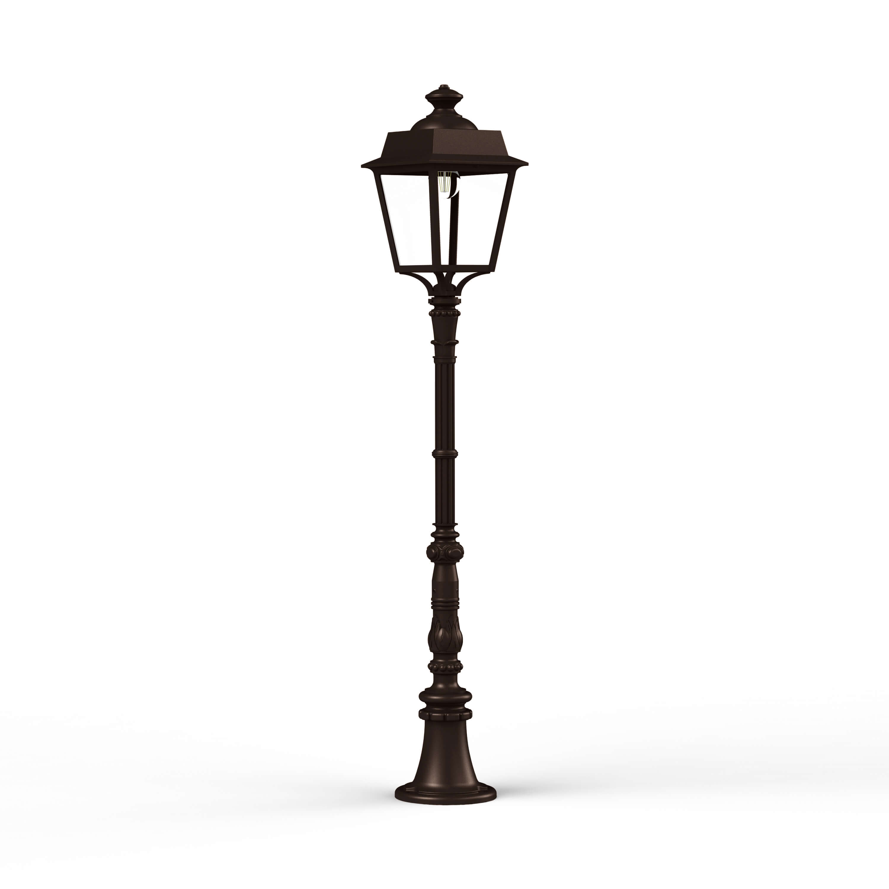 Aussenleuchte Place des Vosges 1 Evolution M11 von Roger Pradier© mit einer Höhe von 130.7cm und einer Breite von 22cm. Produziert in Frankreich bei höchster Qualität, welche mit einer Antikorrisionsgarantie von 25 Jahren zugesichert wird. Die Leuchte ist mit einem IP65 Schutz versehen und so gegen die meisten Einwirkungen aus dem Alltag abgesichert. Wähle die passende Konfiguration (Glas, Farbe, Leuchtmittel etc.) um deinen Vorstellungen gerecht zu werden.