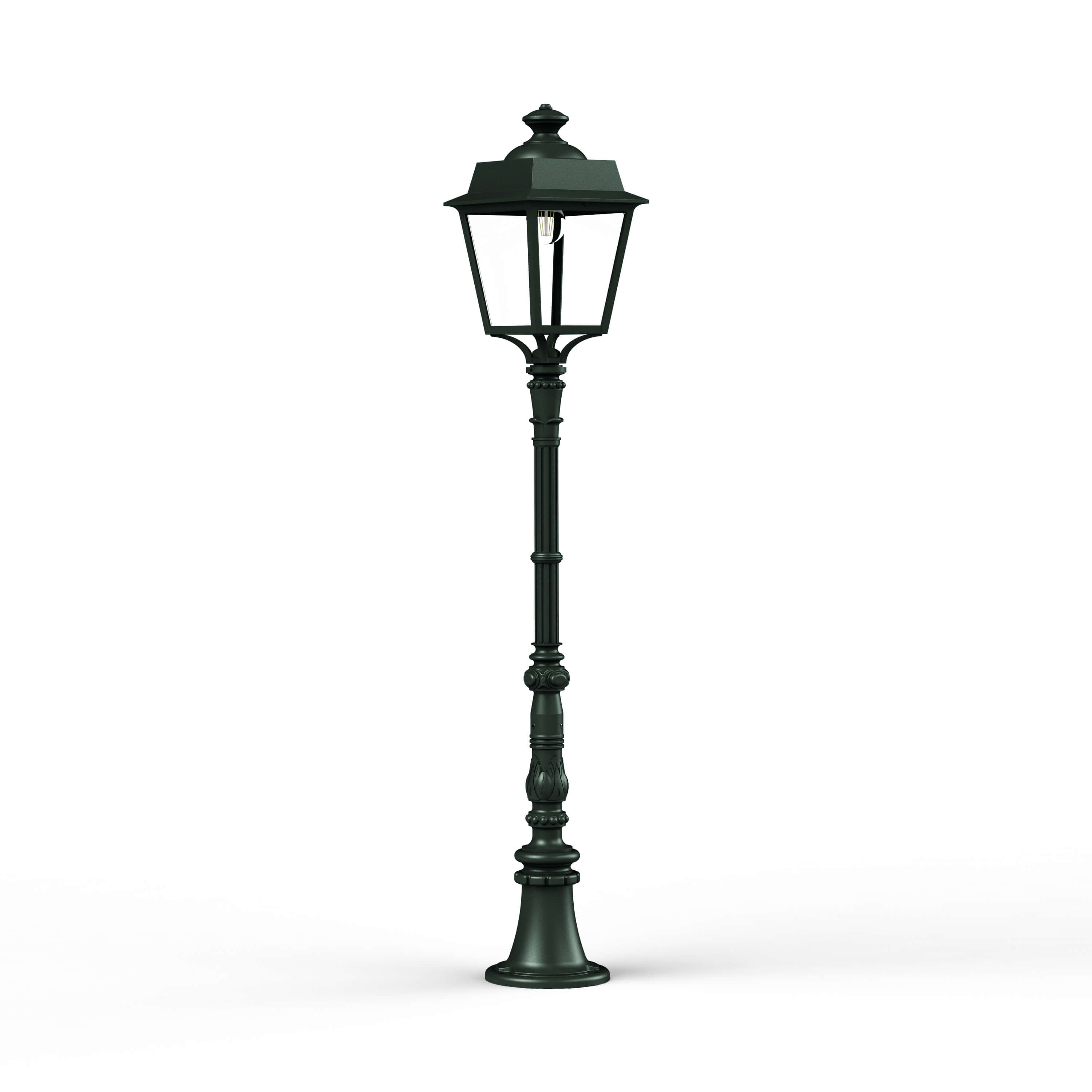 Aussenleuchte Place des Vosges 1 Evolution M11 von Roger Pradier© mit einer Höhe von 130.7cm und einer Breite von 22cm. Produziert in Frankreich bei höchster Qualität, welche mit einer Antikorrisionsgarantie von 25 Jahren zugesichert wird. Die Leuchte ist mit einem IP65 Schutz versehen und so gegen die meisten Einwirkungen aus dem Alltag abgesichert. Wähle die passende Konfiguration (Glas, Farbe, Leuchtmittel etc.) um deinen Vorstellungen gerecht zu werden.