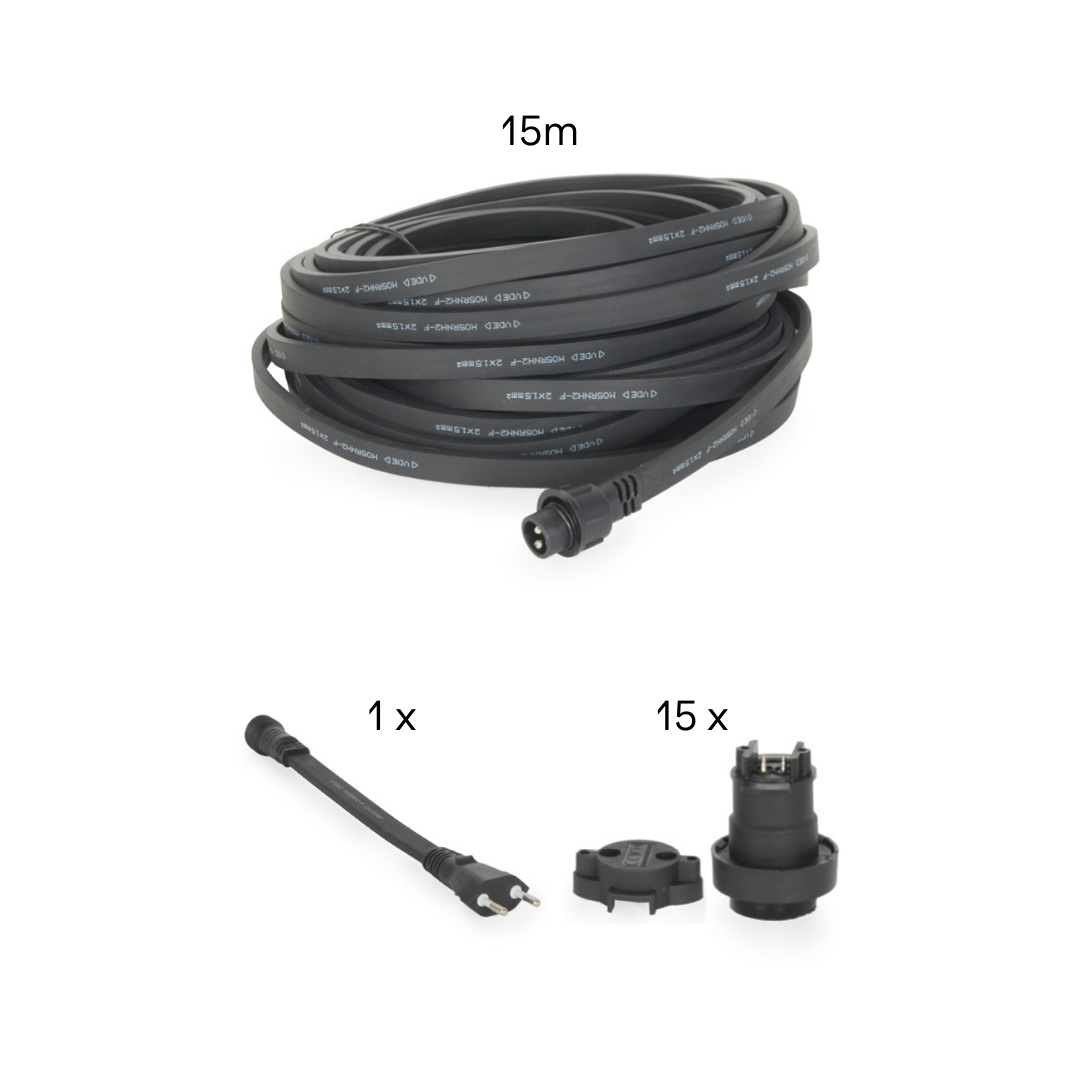 - 15 m Illu-Flachkabel mit aufgegossenen Schraubstecker für den Anschluss und die mögliche Erweiterung der Lichterkette