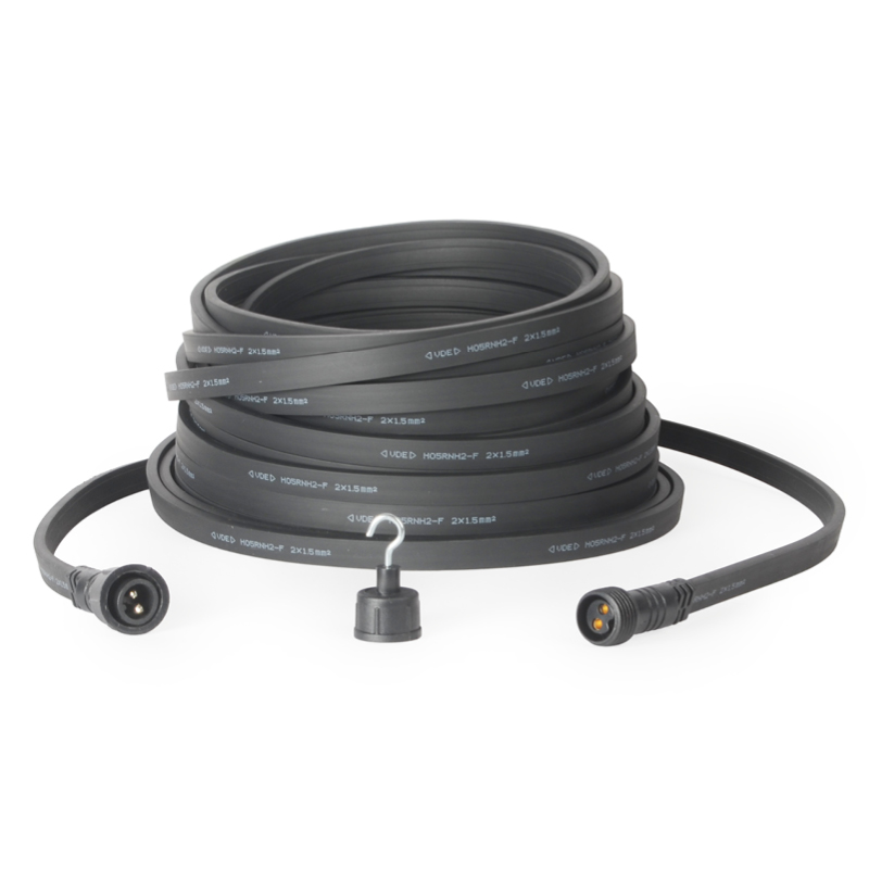 Durch die flache Bauform lässt sich das Kabel unauffällig, platzsparend und ordentlich verlegen, zum Beispiel entlang von Kanten, unter Abdeckungen oder in engen Führungspunkten. Der Leiterquerschnitt von 2×1,5 mm² sorgt für eine stabile Stromversorgung über über den Leiterkabeln im Inneren des Kabels. Das Kabel ist kompatibel mit E27-Illu-Fassungen sowie gängigem Illu-Montagezubehör wie Montagehilfen, Verbindungselementen und Verbindungskabeln.