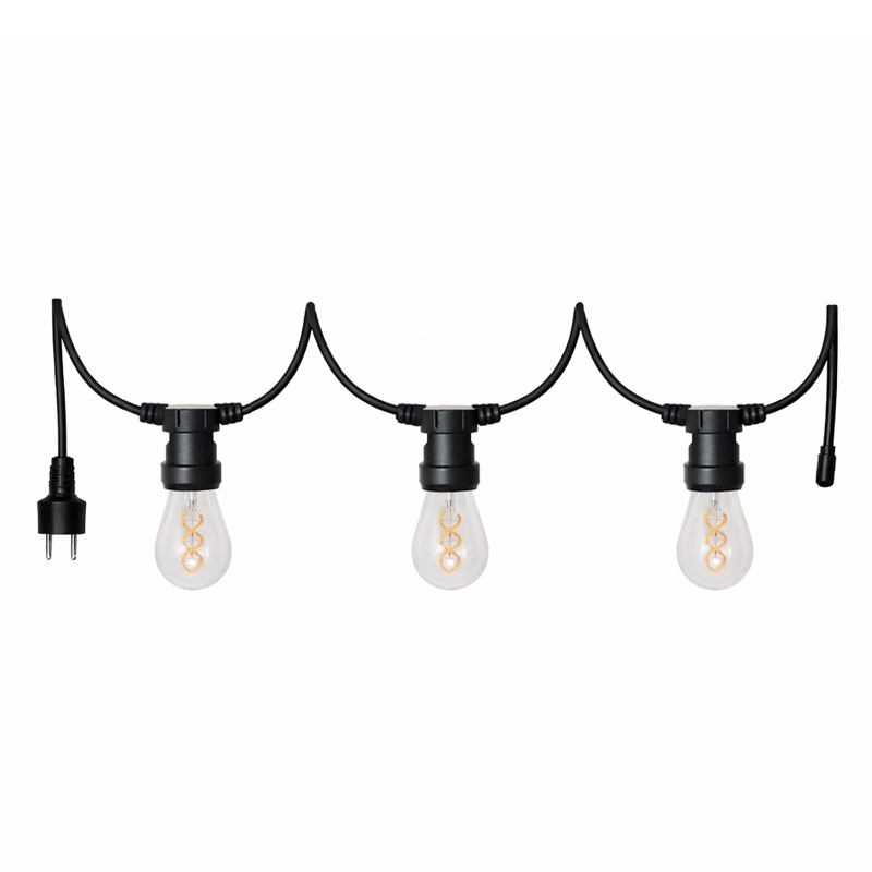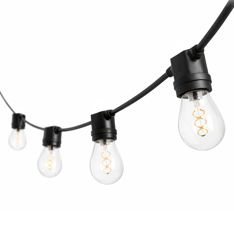 Diese 10,35 m lange Lichterkette vom Typ "Screw" kann an den Seiten mit Hilfe von Schrauben / Nägeln an den E27 Lampenfassungen überall und direkt befestigt werden. Diese Lichterkette ist die perfekte Lösung, wenn sie direkt auf Holz oder ähnlichem montiert wird. Ideal als permanente und indirekte Beleuchtung unter dem Dachvorsprung. Man unterscheidet die Formen "Loop", "Swing" und "Screw", die sich jeweils auf die Montagemöglichkeit und auf ihr aussehen beziehen (siehe Vergleich in der Bildstrecke). Deiner Fantasie sind also kaum Grenzen gesetzt. Konfiguriere deine Lichterkette so, wie du sie am besten brauchst. Die Länge wurde genau so gewählt, dass der Abstand zwischen den Fassungen mit 75 cm auch bei unterschiedlichen Kombinationen gleich bleibt. Es können 14 Leuchtmittel mit max. 15W in die 14 Fassungen eingesetzt werden.