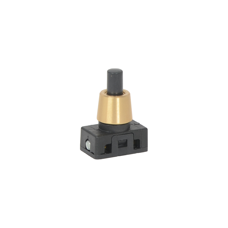 Einpolliger On/Off Druckschalter mit 250V 2A. Befestigung über ein Gewinde M10x1, die konische Befestigungsmutter ist in fünf verschiedenen Farben erhältlich. Betätigungsknopf in schwarz.