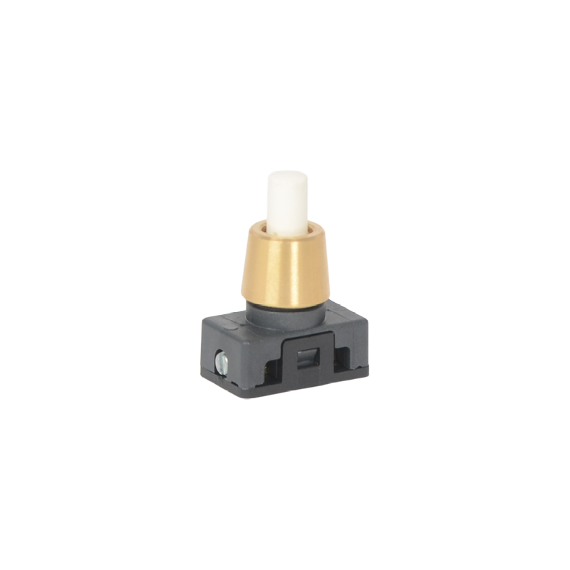 Einpolliger On/Off Druckschalter mit 250V 2A. Befestigung über ein Gewinde M10x1, die konische Befestigungsmutter ist in fünf verschiedenen Farben erhältlich. Betätigungsknopf in weiss.